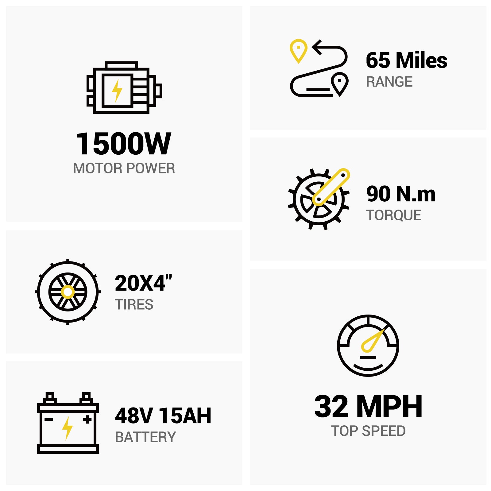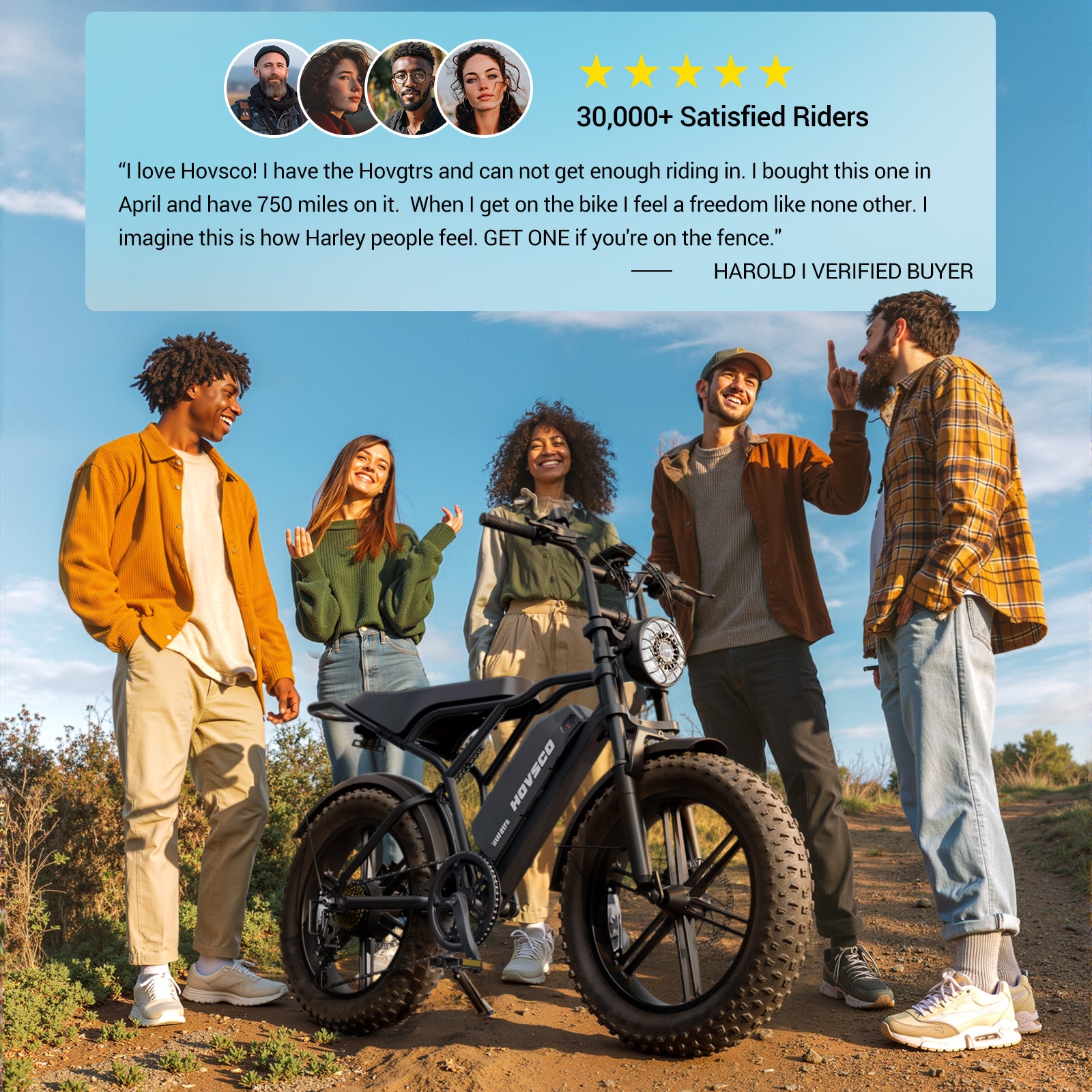 Meet the HovGtrs – a powerhouse moped-style electric bike built for both performance and comfort. With a 1500W high-torque motor, you’ll reach speeds of up to 32 MPH and enjoy a smooth ride even on rough terrain thanks to its full suspension design. Cruise up to 65 miles on a single charge and tackle hills effortlessly with a 90 N·m torque sensor that delivers natural, responsive power.